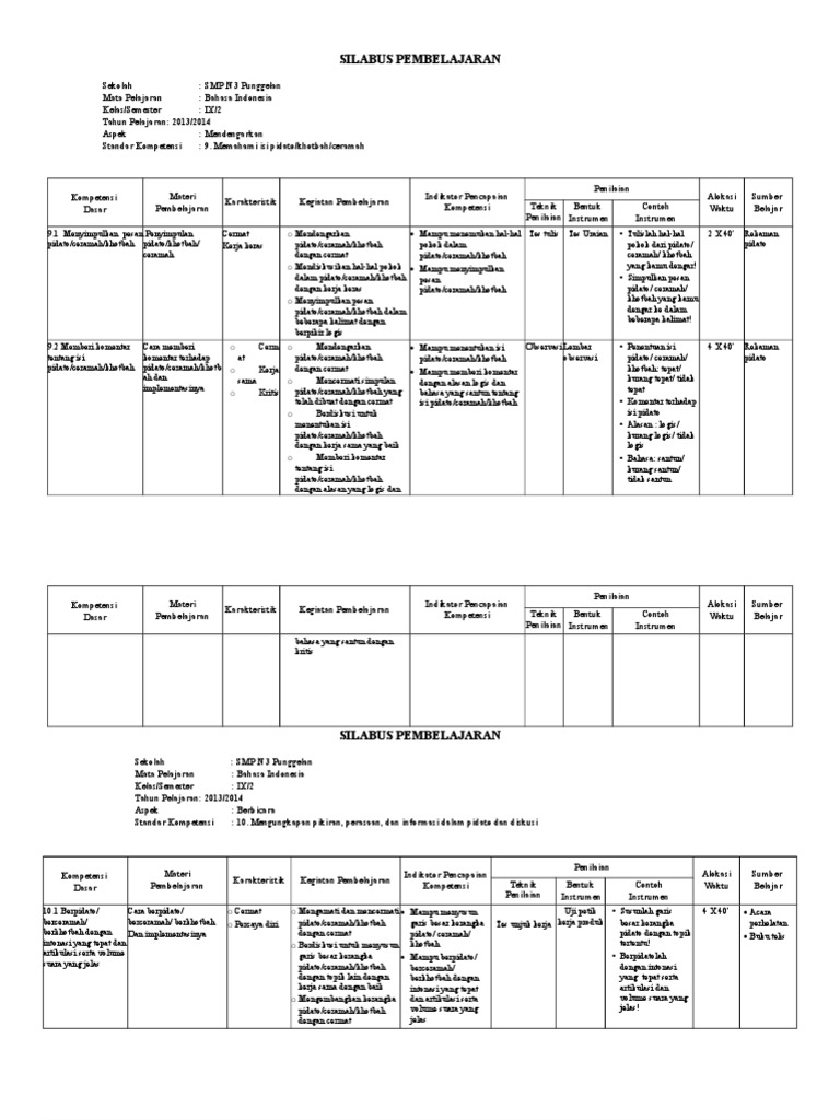 Silabus bahasa indonesia smp kelas 8 kur 13 edisi revisi 2019 terdiri dari 3 model yakni model 1 dengan 8 kolom, model 2 dengan 7 kolom dan model silabus mapel bahasa indonesia kelas 8 k13 revisi 2019/2020 ini di buat dengan menggunakan aplikasi pengolah kata ms word sehingga dapat.